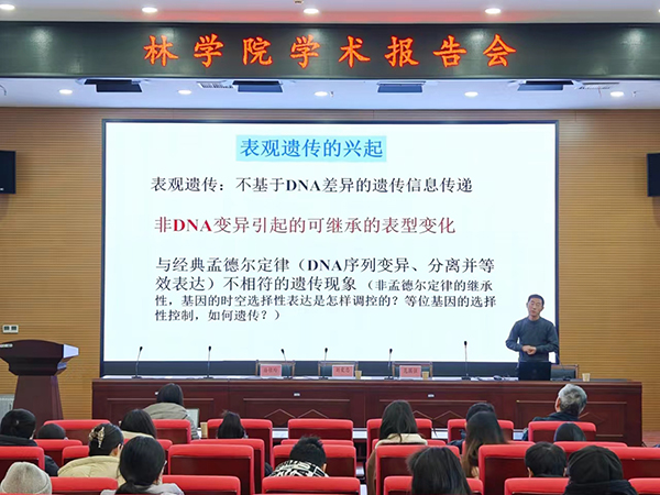 刘爱忠教授以“从拉马克到植物表观遗传研究前沿”为题作报告。他指出,表观遗传是非DNA变异引起的可继承的表型变化,而DNA和组蛋白甲基化是表观遗传的重要原因,组蛋白修饰影响核小体上组蛋白和DNA的结合程度从而影响基因的表达。提出植物表观遗传研究前沿研究主要包括三个方面:“植物多样的环境耐受性怎么产生的?”“植物不同组织基因时空表达规律是怎么产生的?”以及“等位基因的表达分化是如何发生的?”。并表示,DNA甲基化、组蛋白修饰、染色质重塑是表观遗传发生的主要途径,表观遗传是研究植物适应性进化的重要途径之一。
