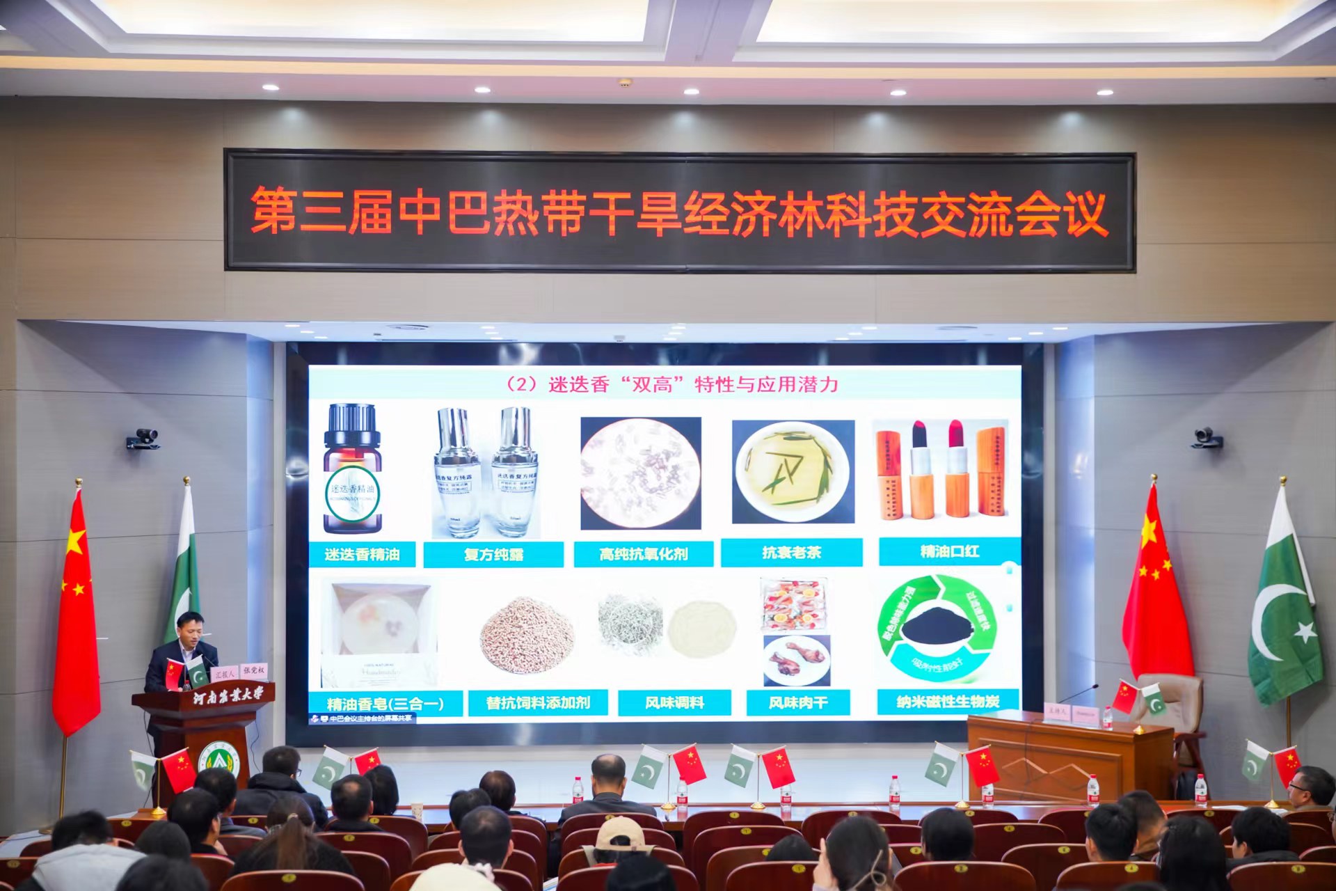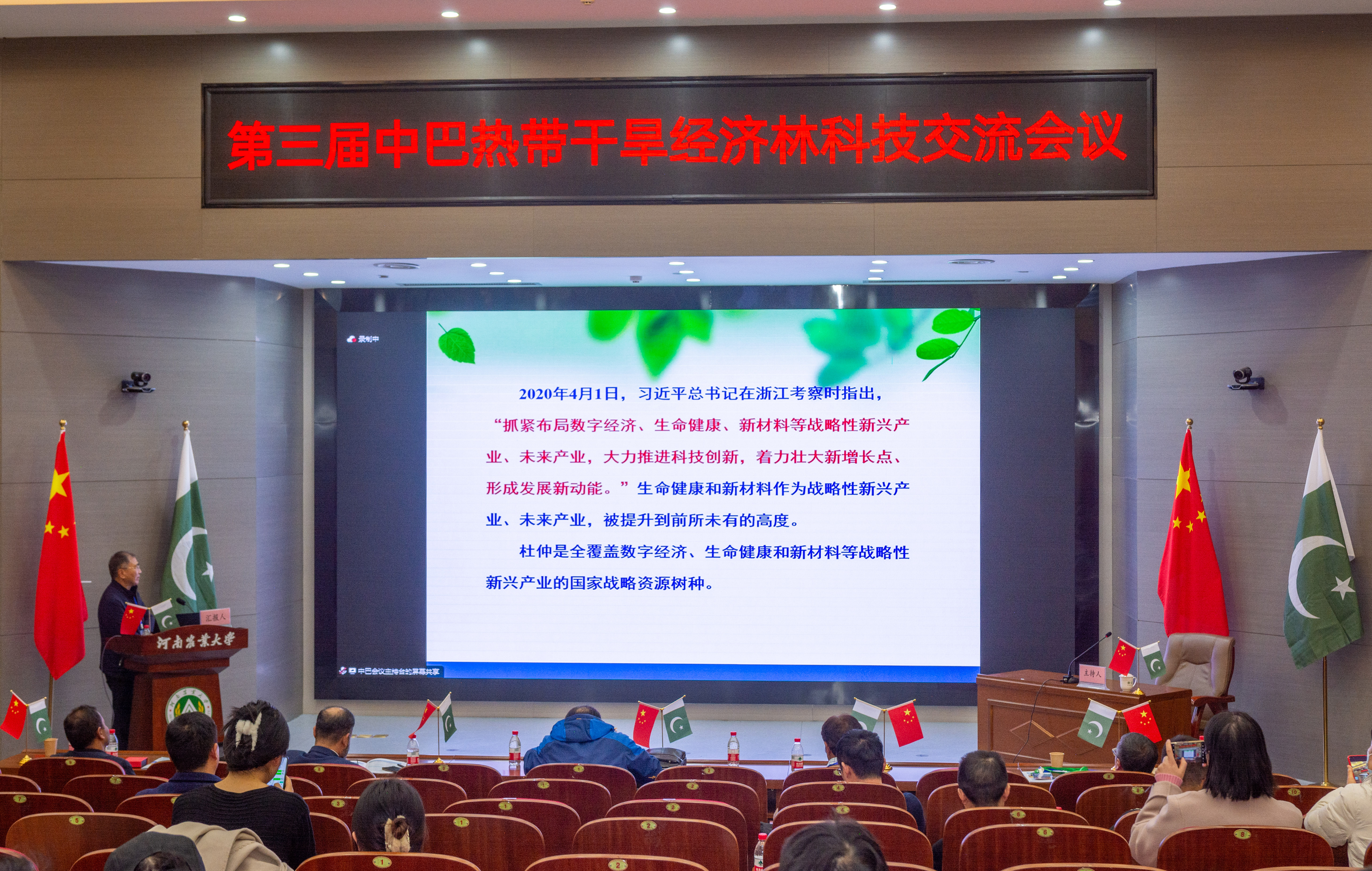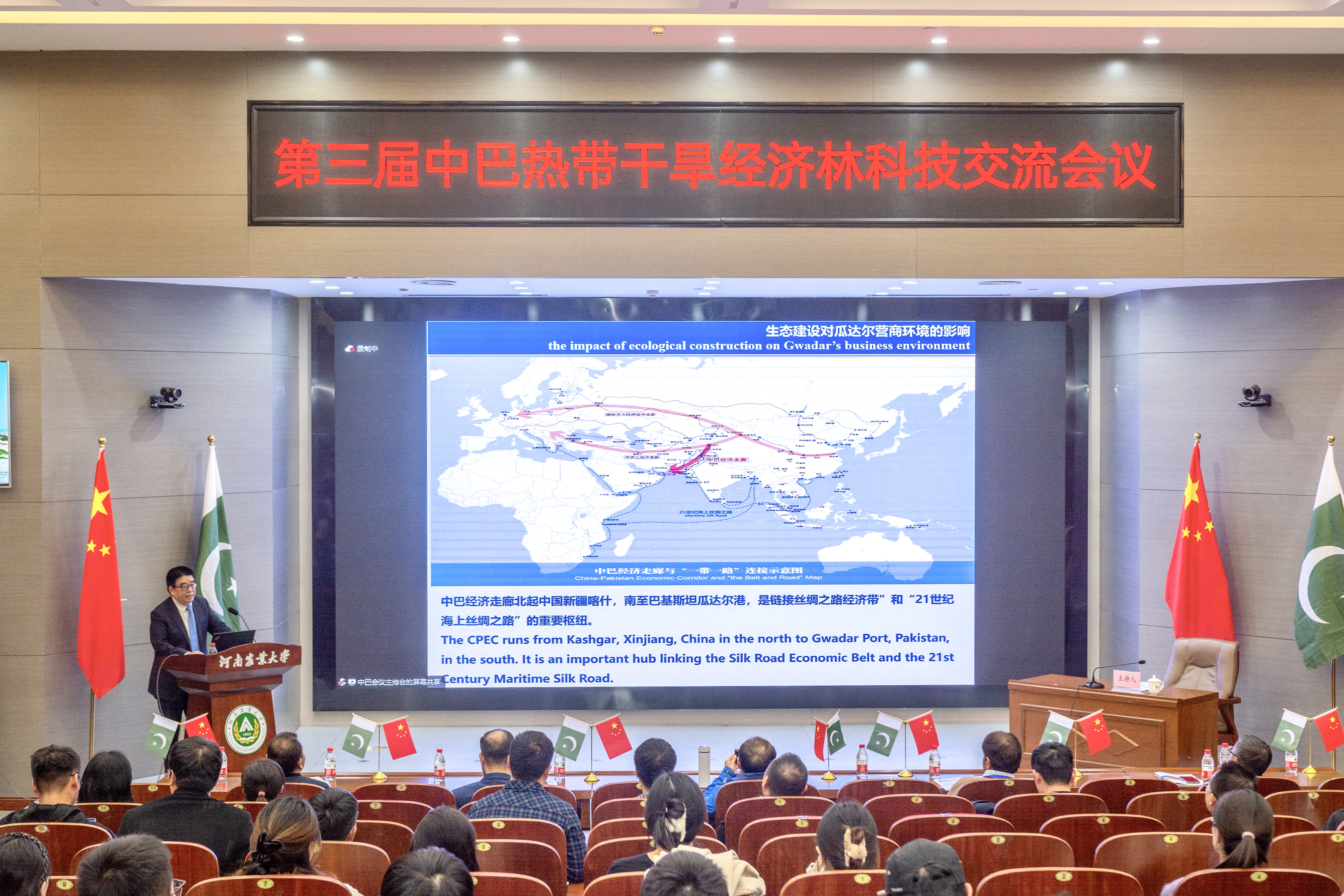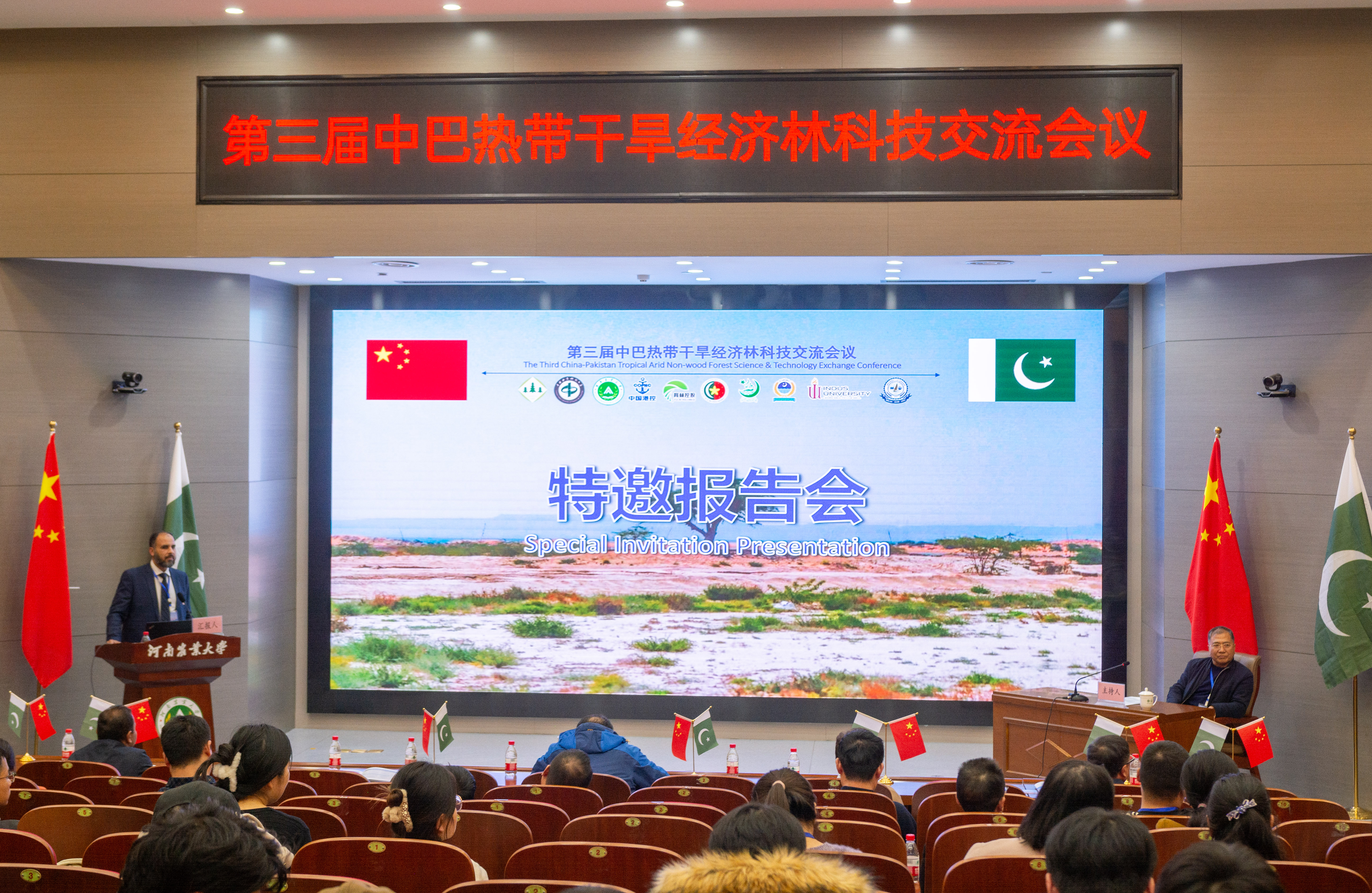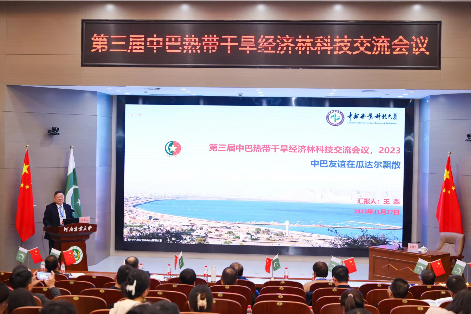 2023年11月27日上午,由中国林学会、中南林业科技大学主办,河南农业大学、河南省林学会、中国林学会经济林分会、中国海外港口控股有限公司、育林控股有限公司、卡拉奇大学、费萨拉巴德农业大学、印度河大学、瓜达尔大学、“一带一路”干旱经济林国家创新联盟、湖南省“一带一路”热带干旱经济林国际联合研究中心承办的第三届中巴热带干旱经济林科技交流会议,以线上线下结合的方式在我校和巴基斯坦瓜达尔自由区同时开幕。本次会议以“木本药材与活性物质”为主题。来自我校和中国林学会、中南林业科技大学、中国林科院经济林中心和亚林中心、巴基斯坦印度河大学、卡拉奇大学、瓜达尔大学、费萨拉巴德农业大学等单位的领导嘉宾、专家学者和企业家等200余人参加会议。校长介晓磊出席会议并致辞。百家乐在线 院长范国强主持会议。