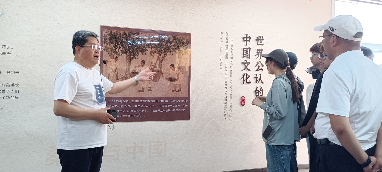 参观伊始,讲解员绘声绘色地为同学们讲解了从古至今千年蚕桑历史文化,同学们倾耳注目、聚精会神地听着讲解员说的一字一句。