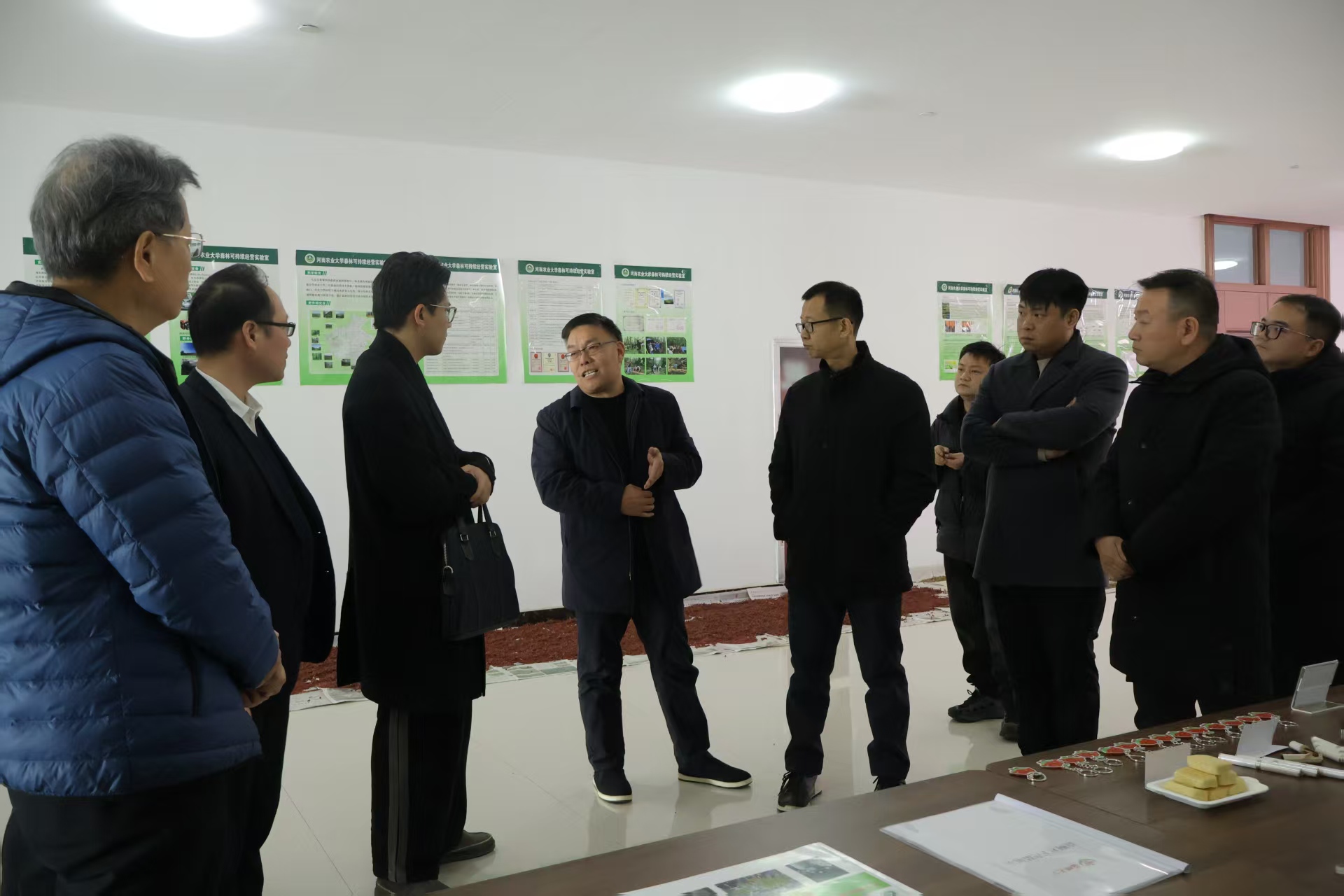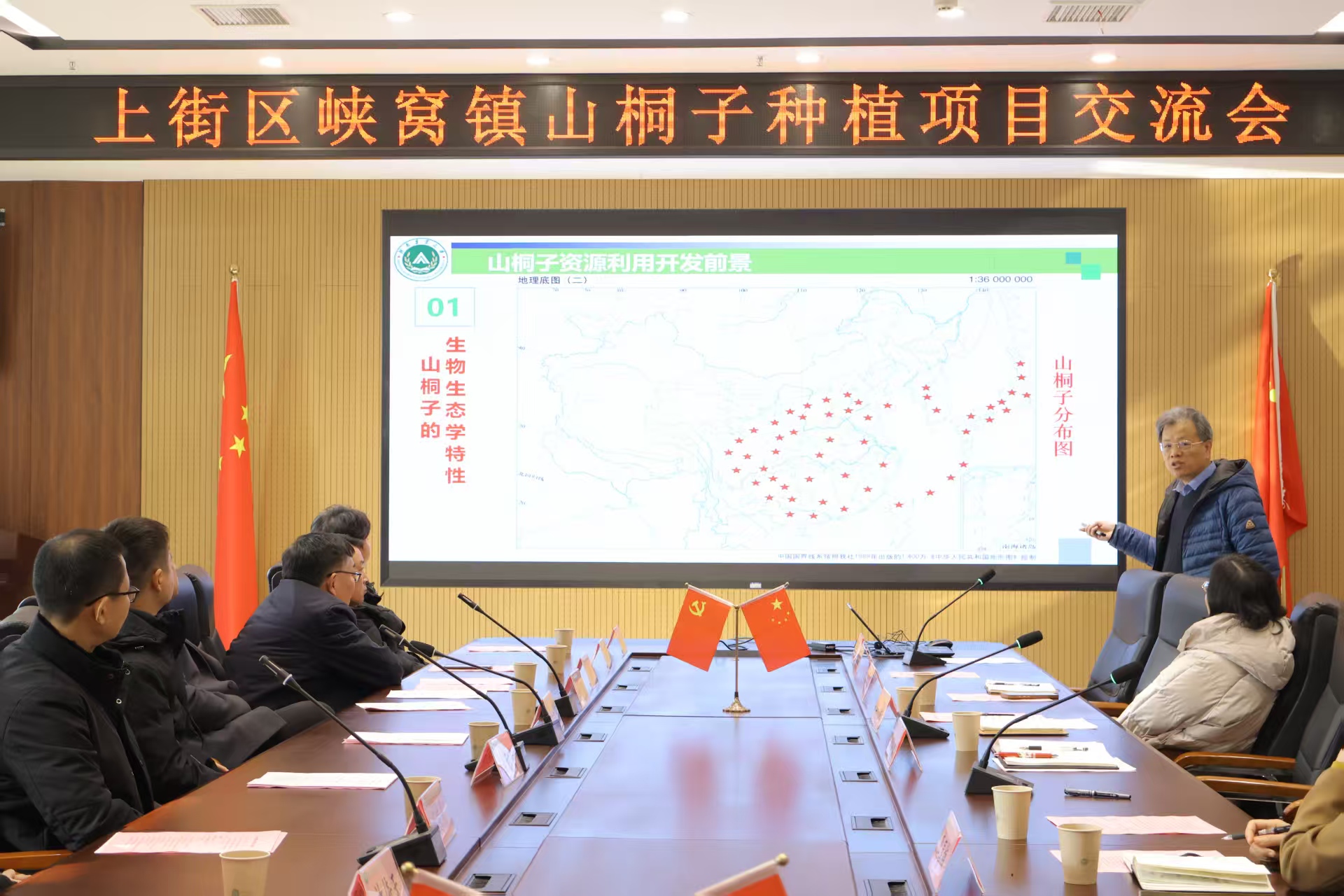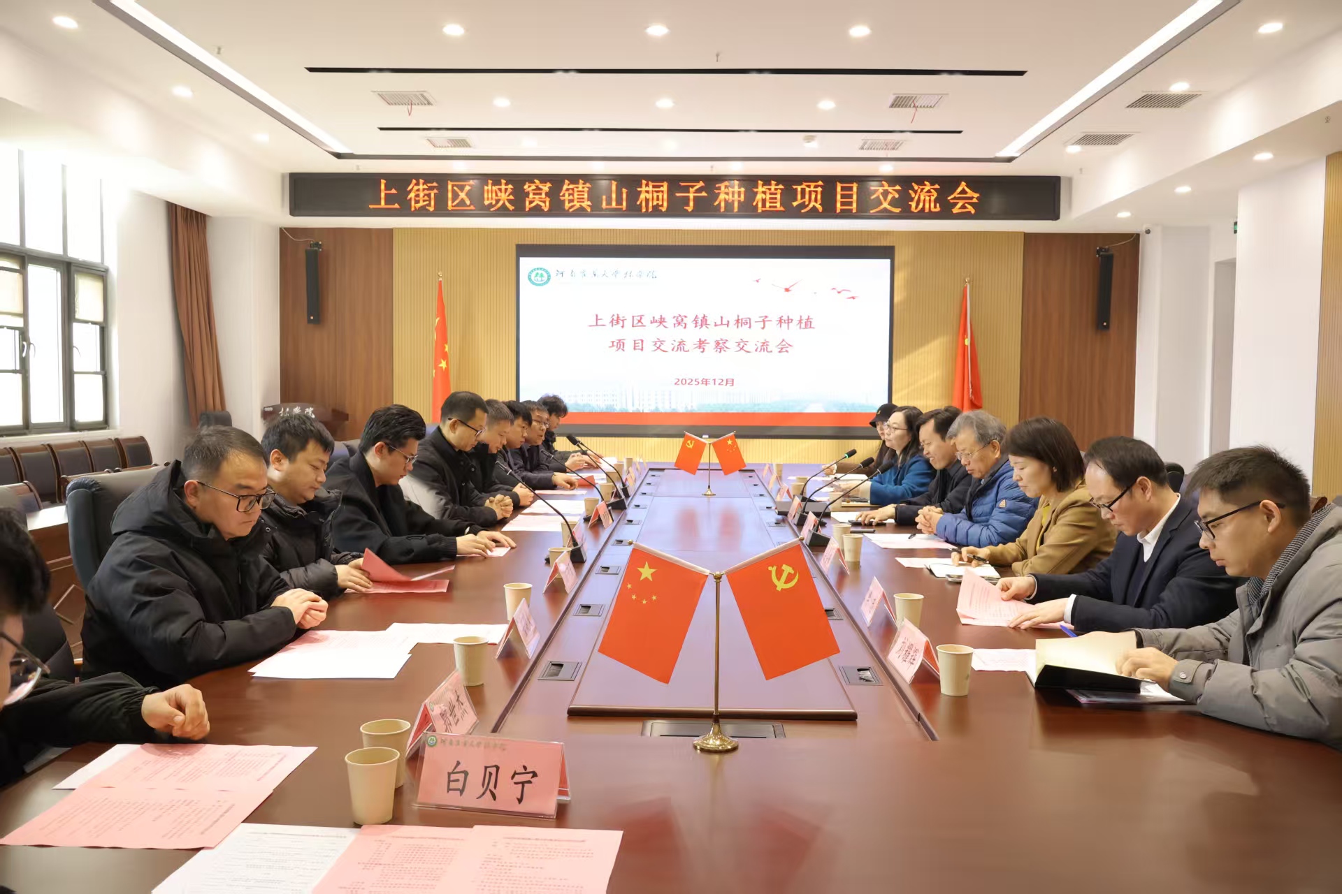 于力行楼南-231会议室举行山桐子种植项目交流会。上街区峡窝镇人大主席朱珂青、峡窝镇副镇长、武装部长吕渊、峡窝镇各村党支部书记、驻马店世威粮贸有限公司等企业代表,院党委书记化青报、河南省山桐子工程技术研究中心主任刘震、副院长李喜梅及山桐子研究团队出席会议。会议由院党委副书记王娟主持。