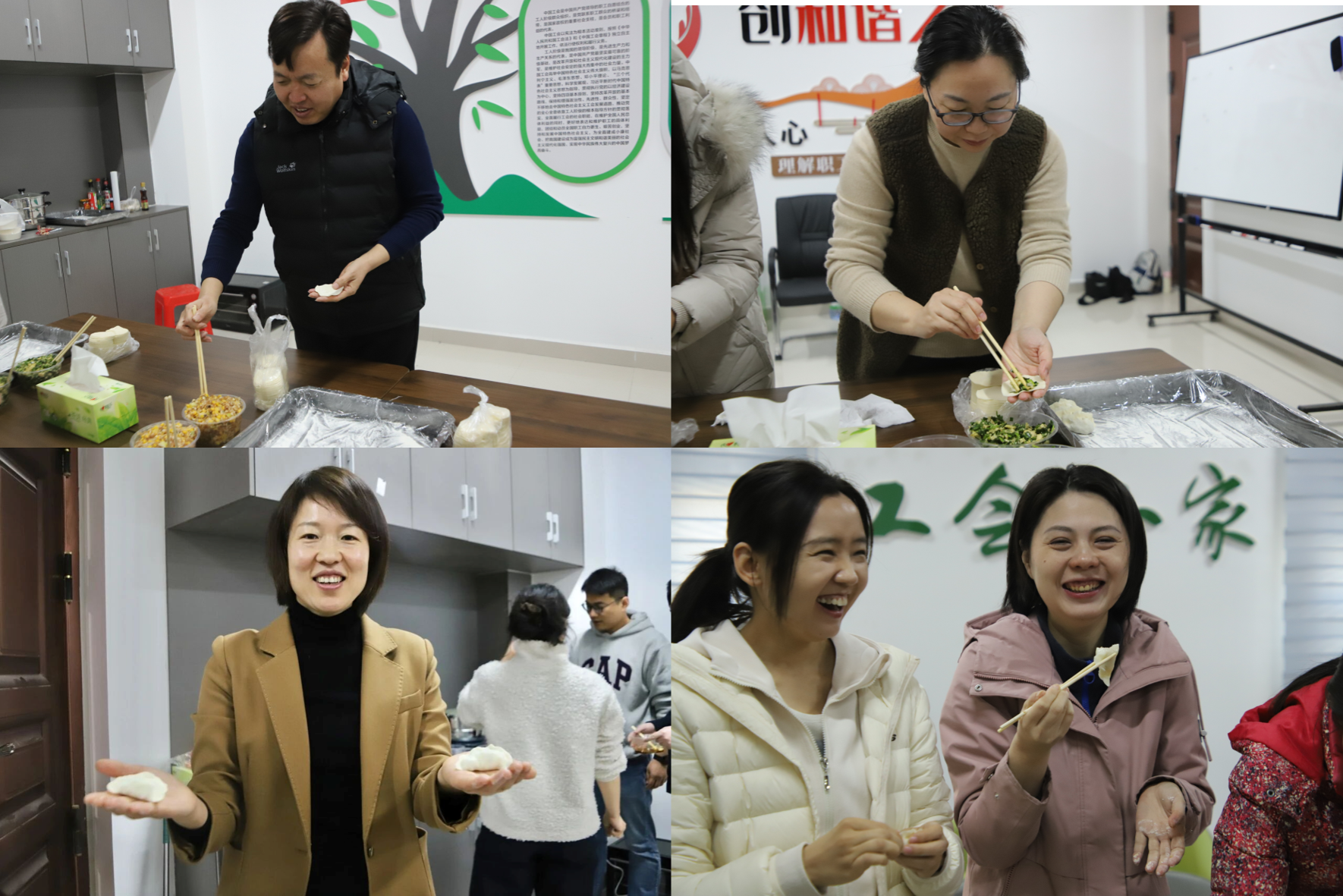 在工会小家大家围坐在一起,分工协作、配合有序。取皮、放馅、捏合成形,动作娴熟而专注。一枚枚饺子在指尖成形,逐渐整齐摆放在案板上,现场氛围轻松而热烈。负责煮饺子的老师,把一碗碗热气腾腾的饺子送到老师们面前,阵阵香气弥漫在活动现场。教职工们共同品尝亲手制作的饺子,在交流互动中分享劳动成果,感受百家乐在线