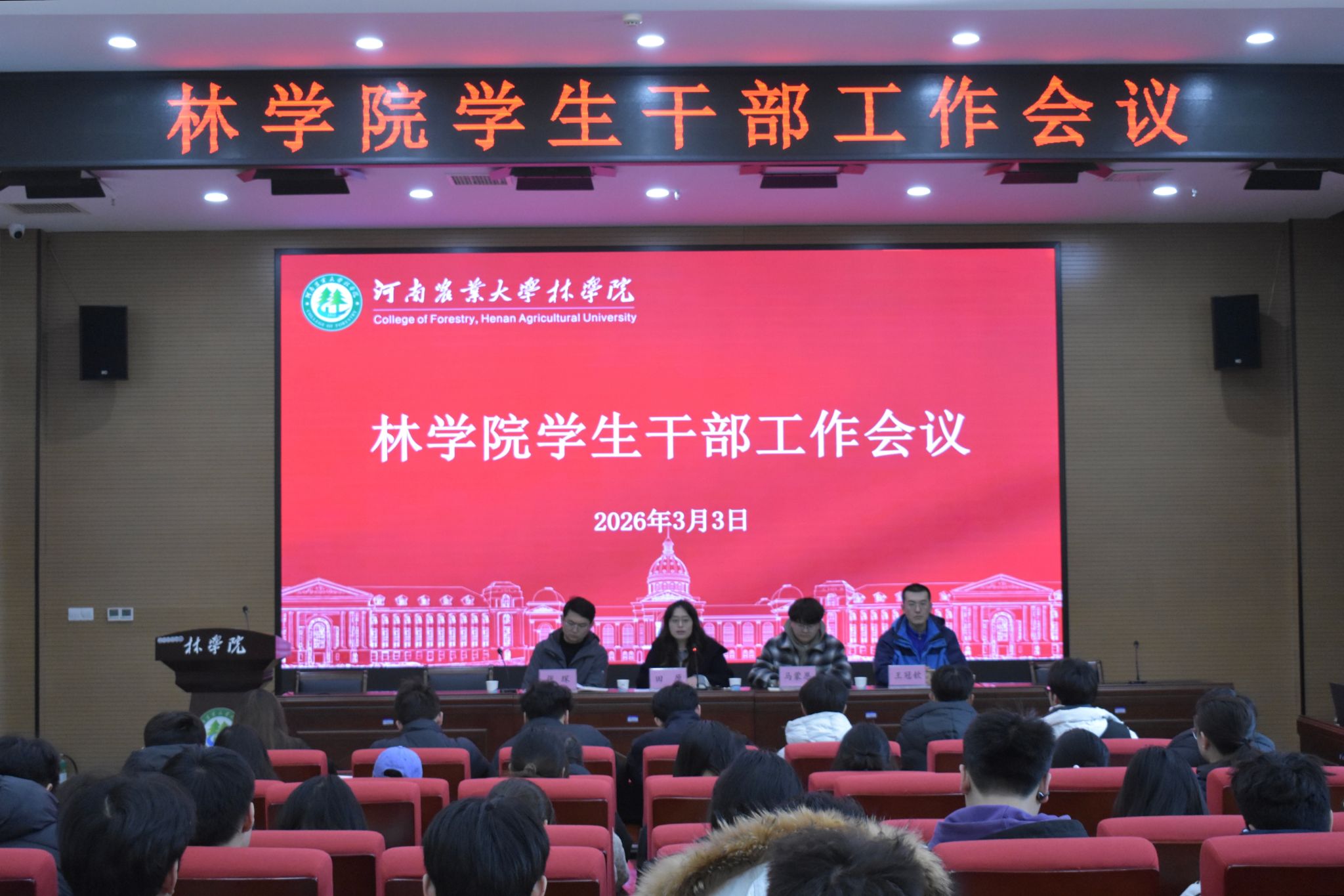 于龙子湖校区力行楼南428报告厅召开新学期学生干部工作会议。院团委书记田原,副科级组织员马蒙恩,副书记张琛,院团委老师王冠钦及全体学生代表参加此次会议。会议由田原主持。