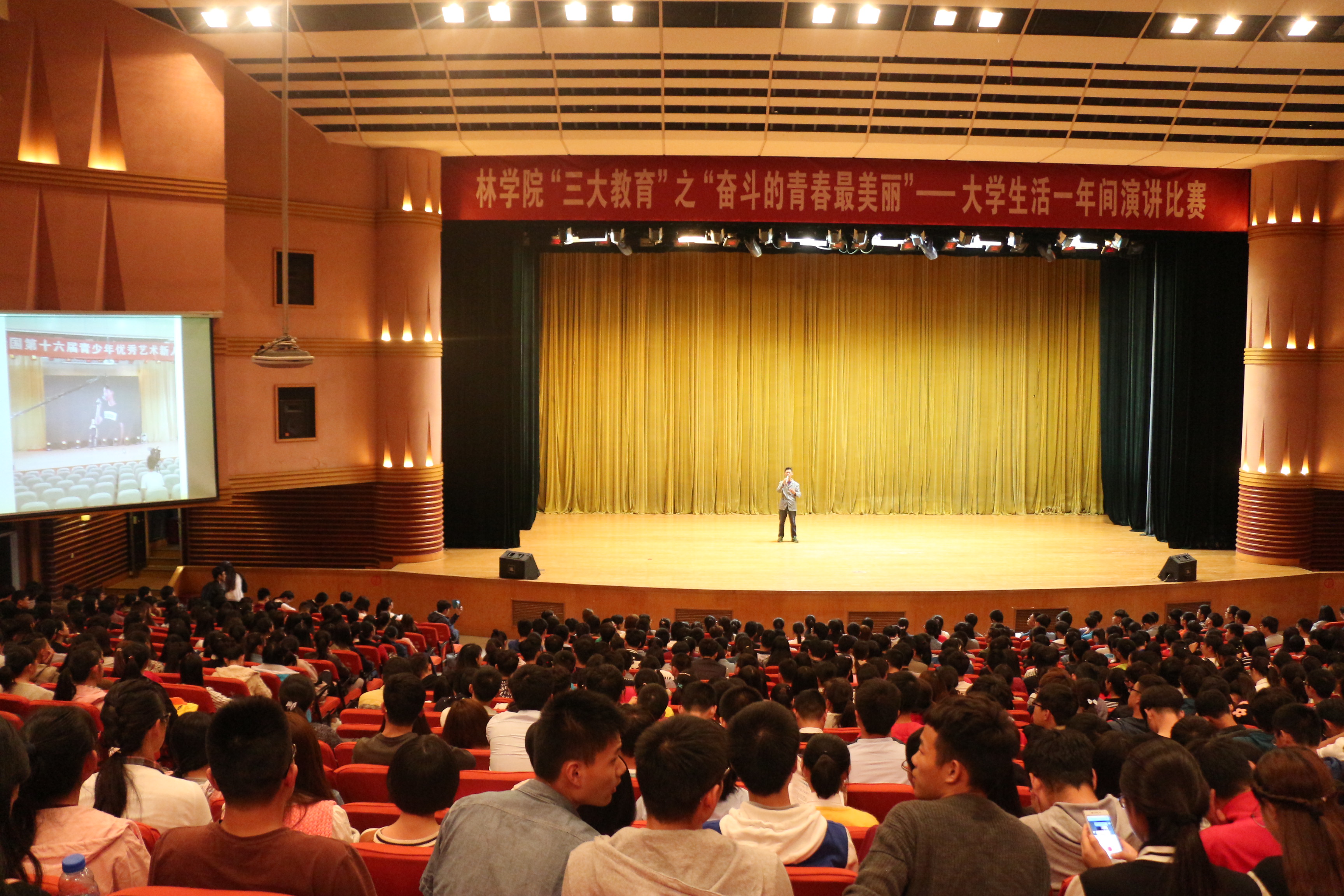 三大教育之奋斗的青春最美丽——“大学生活一年间”演讲比赛决赛在校大礼堂拉开帷幕。院团委书记张保磊、院团委副书记姜鑫,院团委老师郭睿以及15、16级1200余名学生参加此次活动。本次演讲比赛评委由团委老师、第七届部分参赛选手和16级各班代表担任。