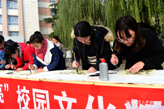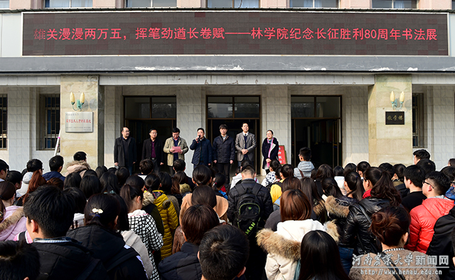 在文化路校区3号楼前举办以“雄关漫漫两万五,挥笔劲遒长卷赋”为主题的书法展活动。校党委副书记、工会主席褚金海出席活动开幕式,并和学校有关部门负责人、大学生们一起观看作品展。